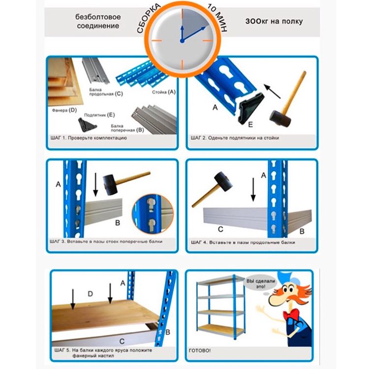 Стеллаж 2000х1830х910 5 полок грузовой, разборный. Стеллажи собираются без болтов с помощью зацепов. Профиль балки МКФ позволяет использовать стеллаж для установки настила из фанеры для хранения продукции в коробках или навалом, а также для хранения автошин от 13" и больше. Стеллажи не собираются в 1 линию с общей стойкой, каждый стеллаж устанавливается отдельно. Вместо настила из фанеры можно изготовить металлические оцинкованные полки. Стеллажи можно использовать как в домашних условиях например гараж или подсобка, а также в торговых или строительных магазинах. Выбирайте грузовые стеллажи из нашего каталога по ваших размерам.